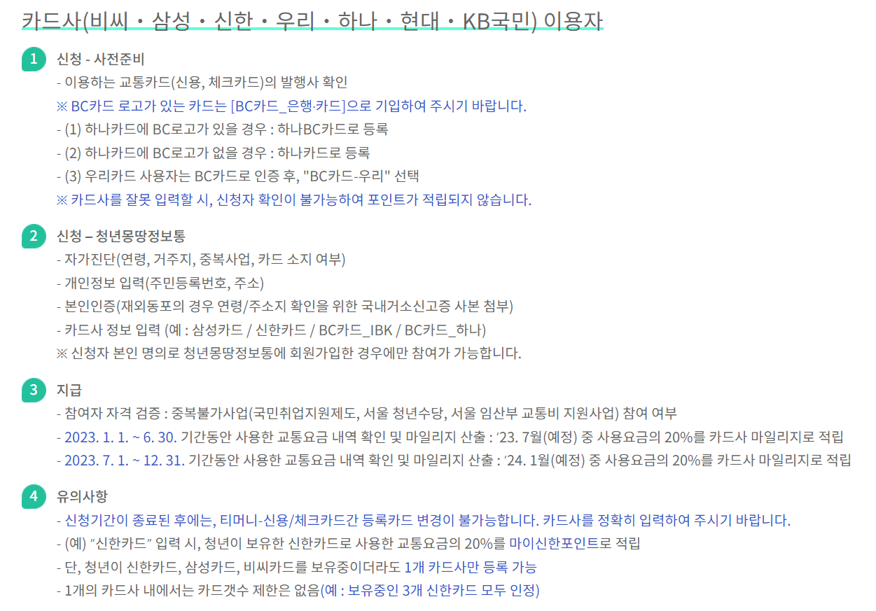 [후불교통] 비씨, 삼성, 신한, 우리, 하나, 현대, KB국민카드 발행 실물카드 및 후불형 모바일 교통카드 - 제외대상 : 2023년 아래 사업에 참여하여 지원금을 수령한 사람