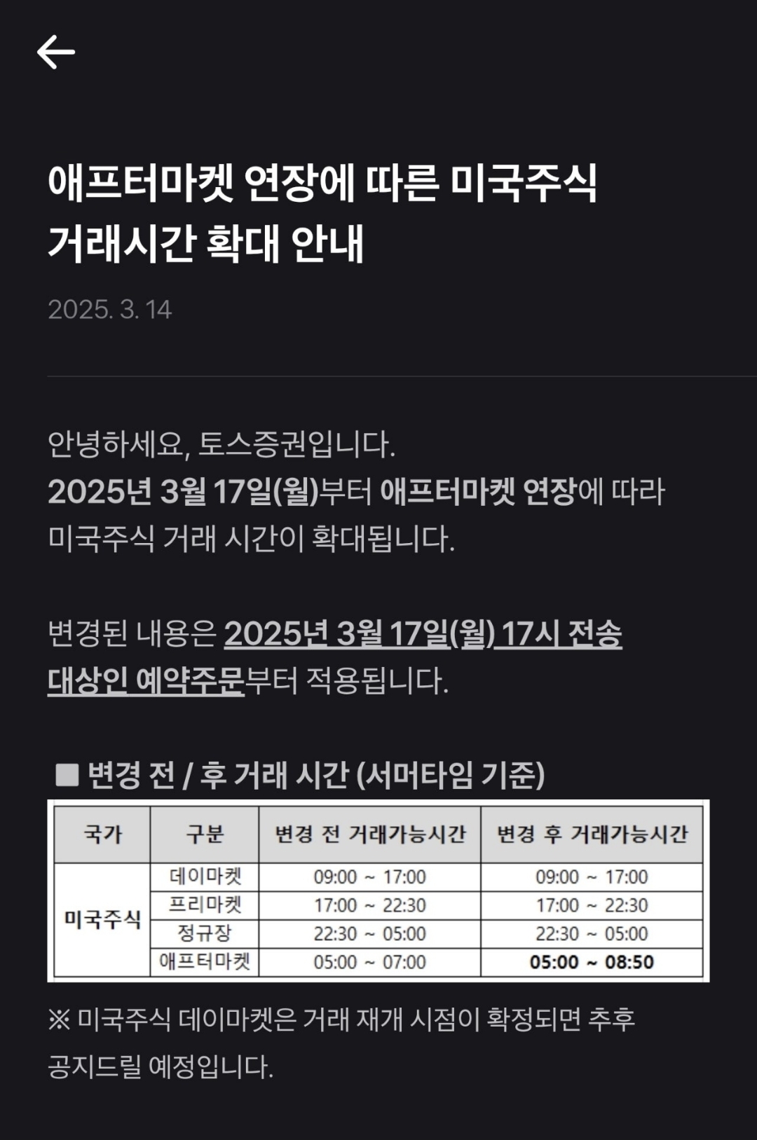 최근 사용중인 토스증권의 미국주식 거래가능 연장 시간안내입니다